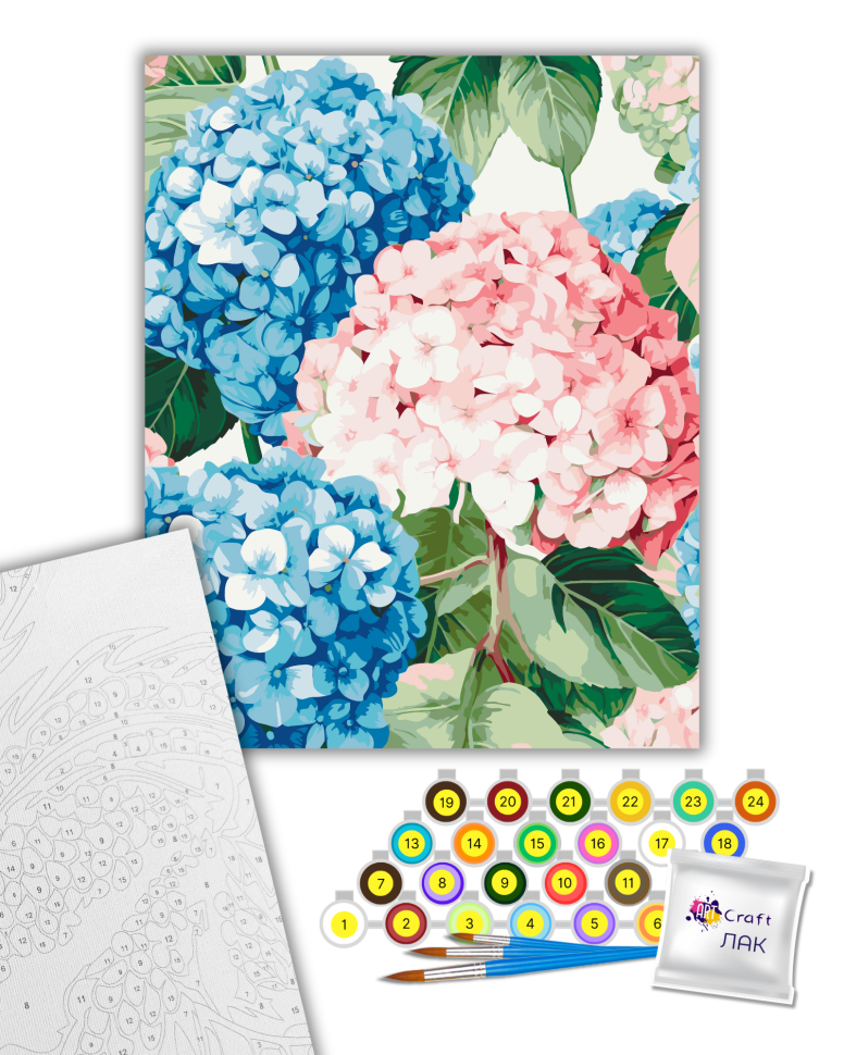 1. Canvas on a wooden stretcher with printed outlines and numbers. The combination of a balanced composition of cotton-based canvas, specially developed acrylic primer and mechanical tension guarantees the elasticity of the canvas and resistance to sagging.