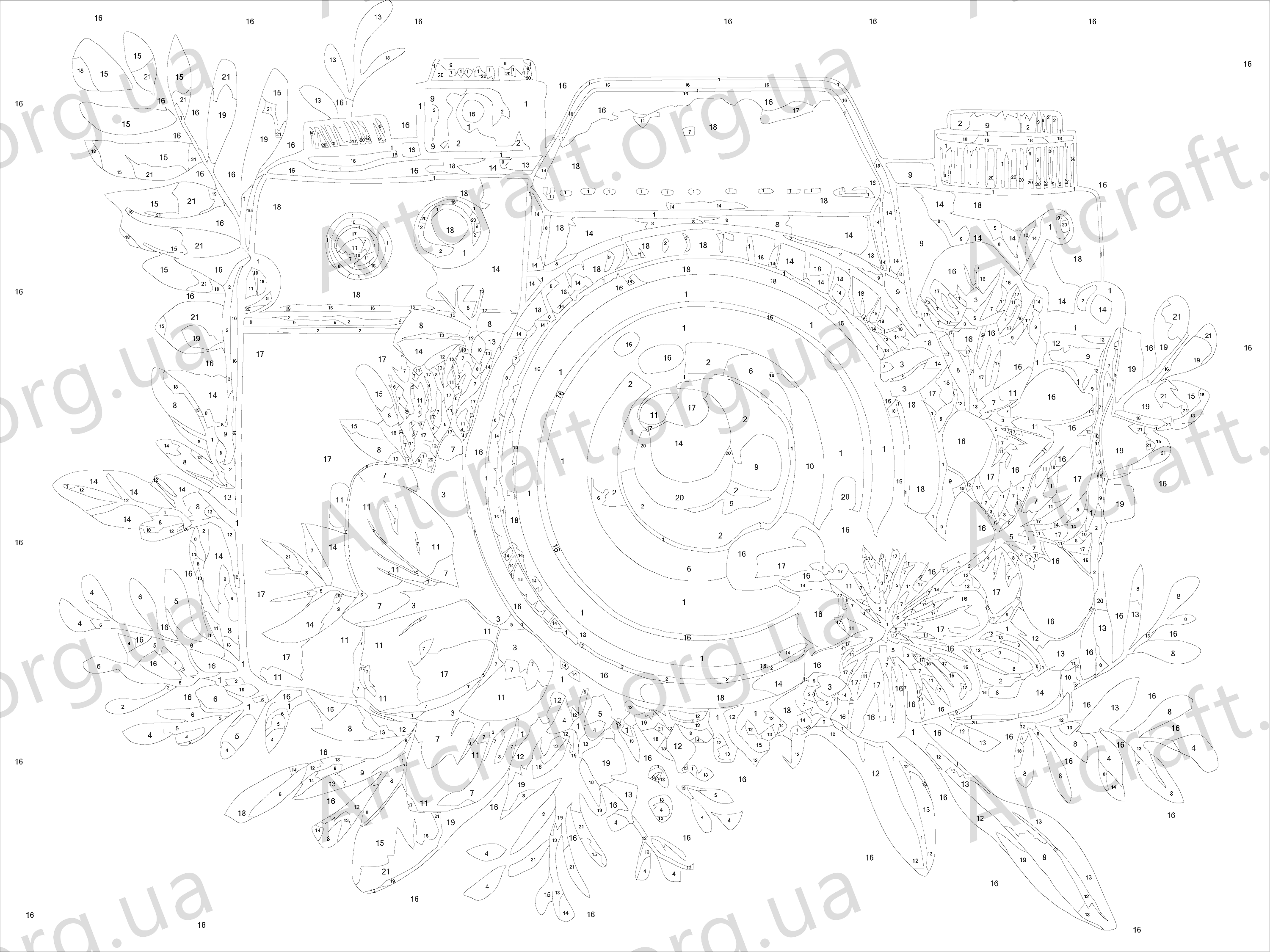 1. A canvas on a wooden stretcher frame with pre-drawn outlines and numbers. The combination of a balanced cotton-based canvas, a specially developed acrylic primer and mechanical stretching ensures the canvas’s elasticity and resistance to sagging.