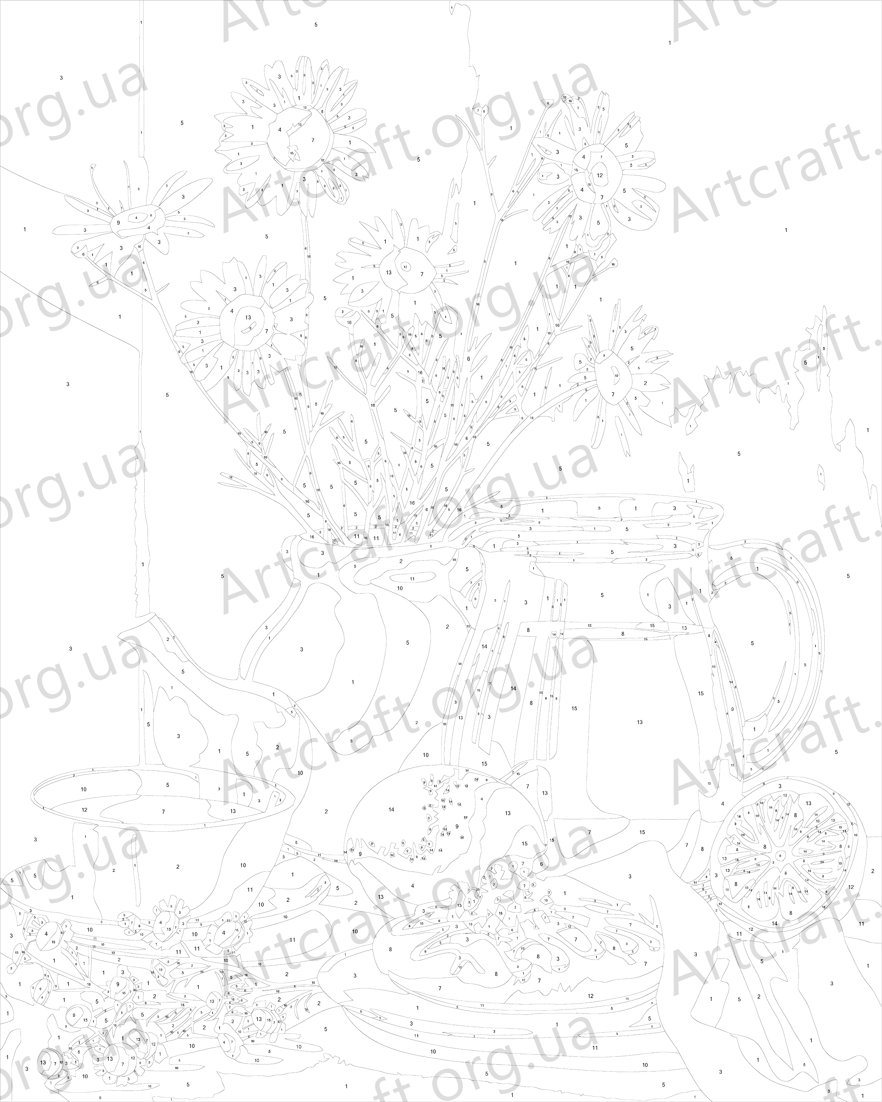 1. A canvas on a wooden stretcher frame with pre-drawn outlines and numbers. The combination of a balanced cotton-based canvas, a specially developed acrylic primer and mechanical stretching ensures the canvas’s elasticity and resistance to sagging.