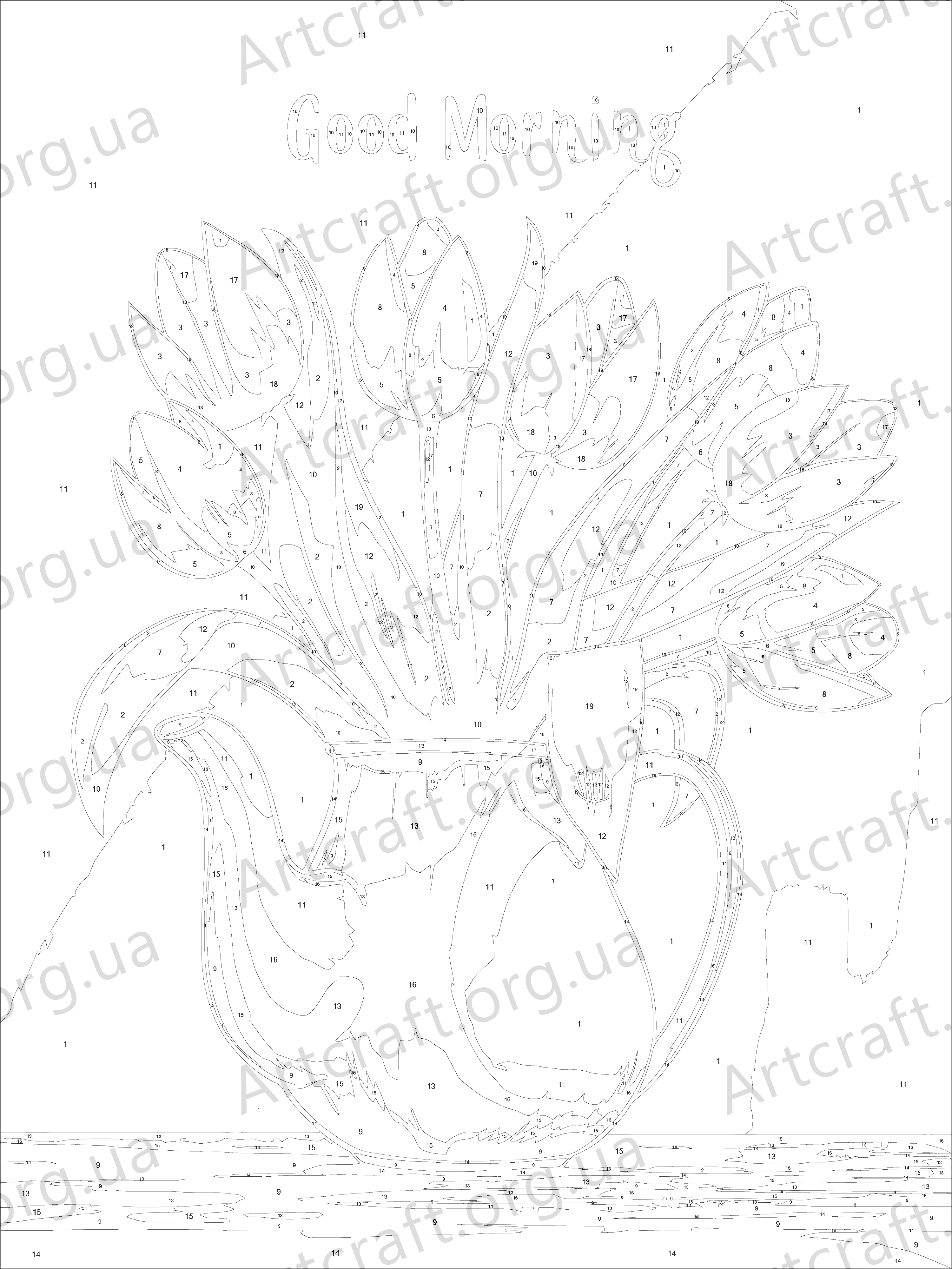 1. Canvas on a wooden stretcher with outlines and numbers. The combination of a balanced cotton-based canvas, specially designed acrylic primer and mechanical stretching guarantees the elasticity of the canvas and resistance to sagging.