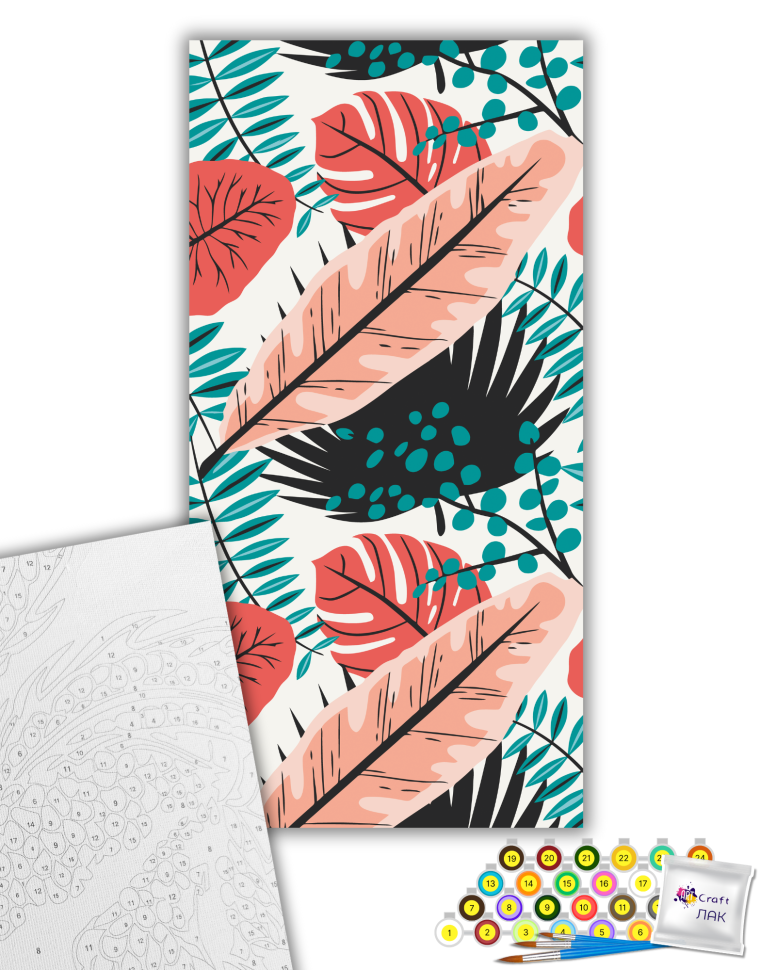 1. Полотно на дерев'яному підрамнику з нанесеними контурами та цифрами. Поєднання збалансованого складу полотна на бавовняній основі, спеціально розробленого акрилового грунту та механічна натяжна – гарантує пружність полотна та стійкість до провисання.
