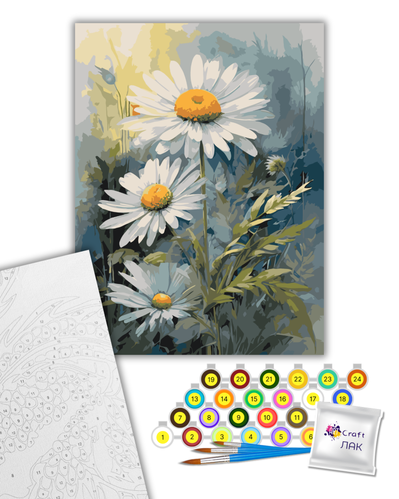 1. Полотно на дерев'яному підрамнику з нанесеними контурами та цифрами. Поєднання збалансованого складу полотна на бавовняній основі, спеціально розробленого акрилового грунту та механічна натяжна – гарантує пружність полотна та стійкість до провисання.