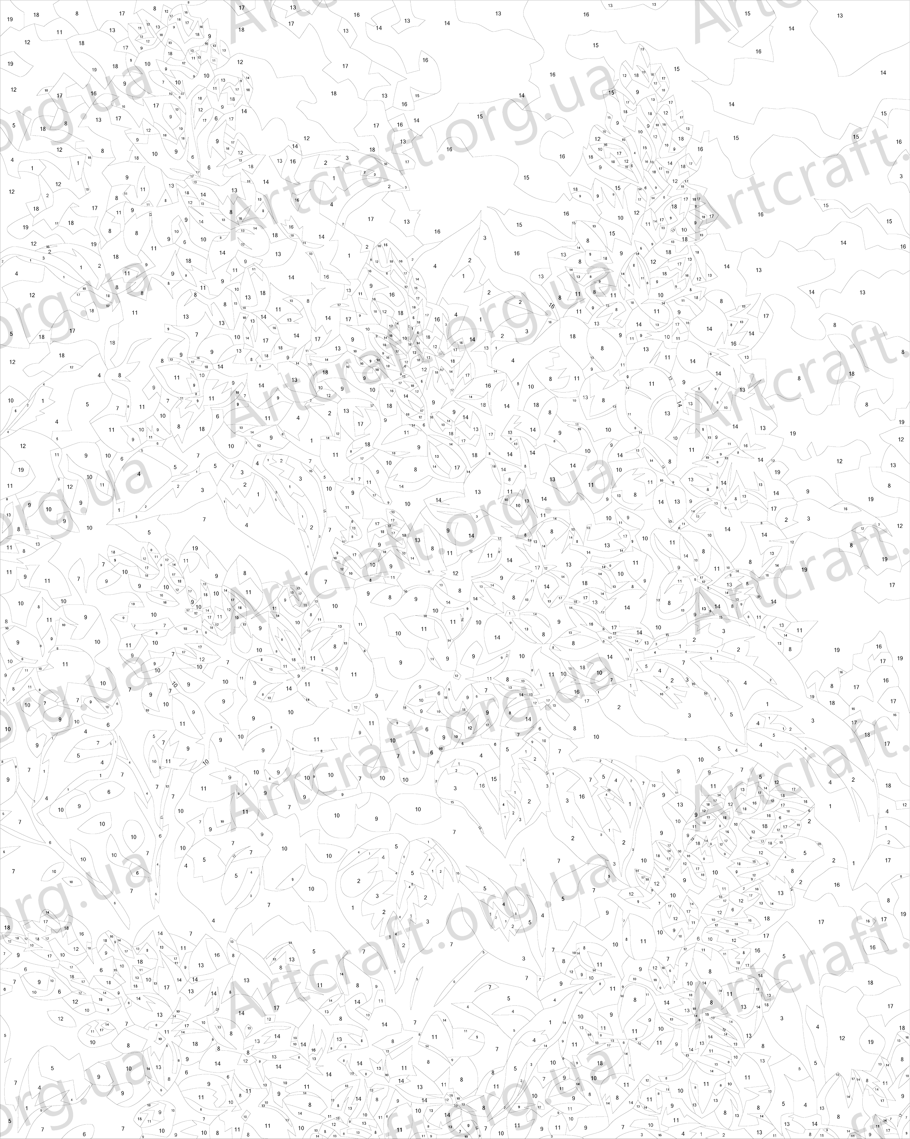 Зроблене з натуральних волокон прогрунтоване полотно з нанесеними контурами та цифрами розміру 40х50 см, щільно натягнуте на деревʼяний підрамник для більшої зручності.