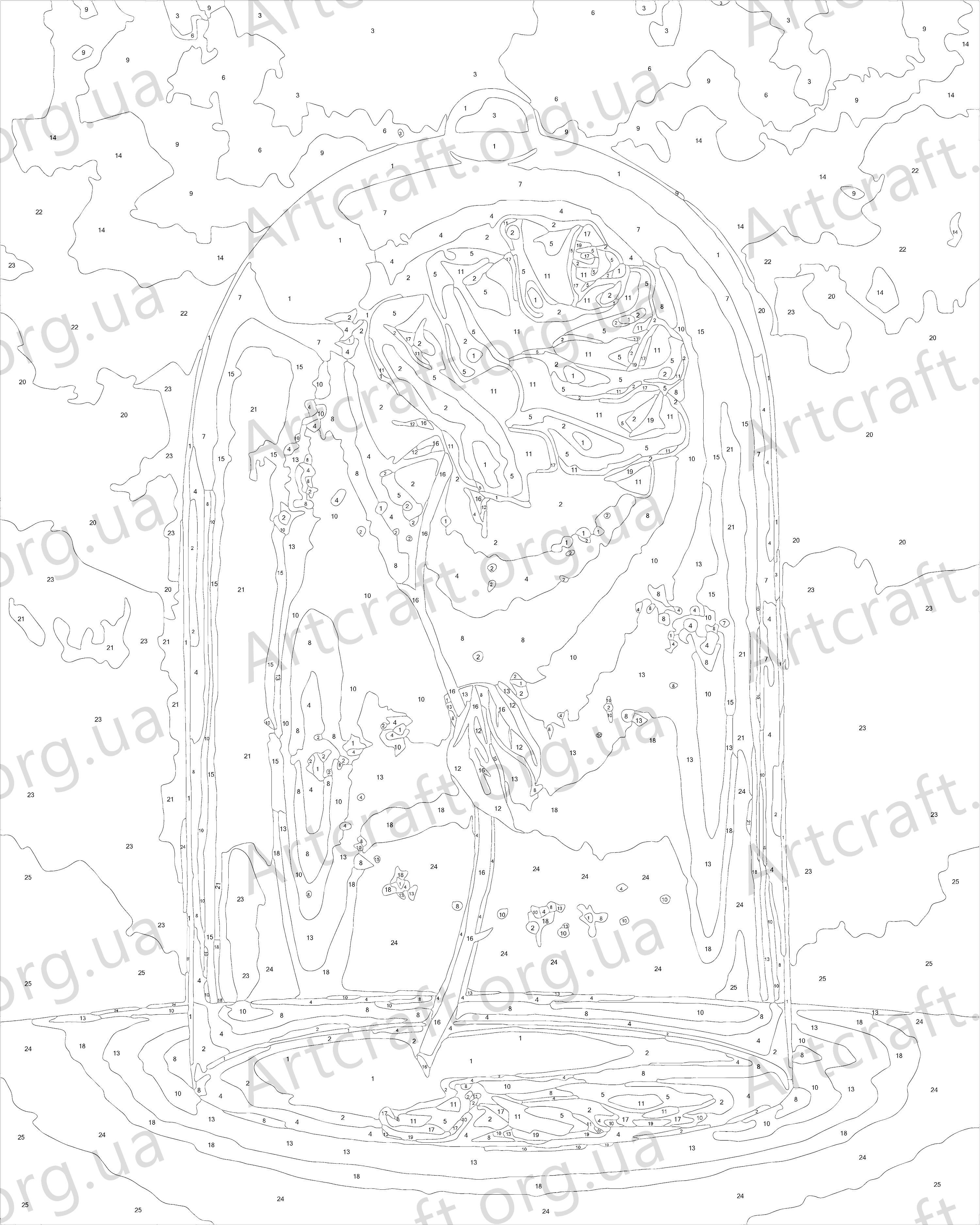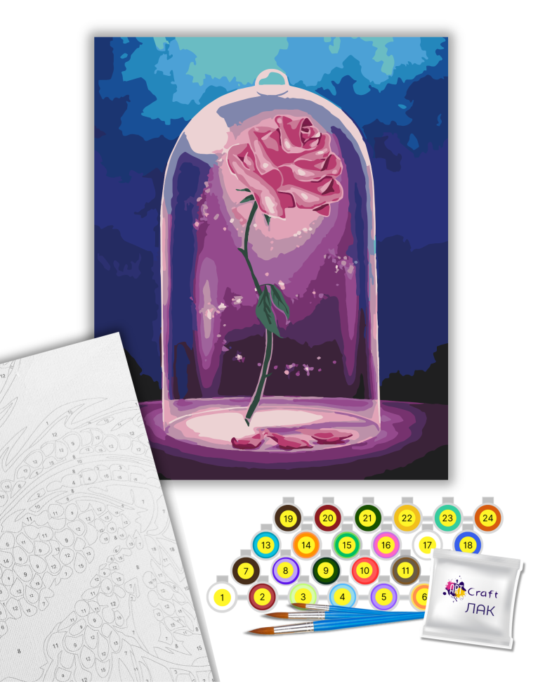 1. Полотно на дерев'яному підрамнику з нанесеними контурами та цифрами. Поєднання збалансованого складу полотна на бавовняній основі, спеціально розробленого акрилового грунту та механічна натяжна – гарантує пружність полотна та стійкість до провисання.