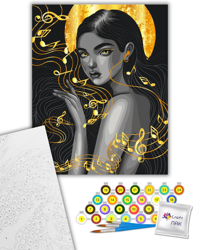 1. Полотно на дерев'яному підрамнику з нанесеними контурами та цифрами. Поєднання збалансованого складу полотна на бавовняній основі, спеціально розробленого акрилового грунту та механічна натяжна – гарантує пружність полотна та стійкість до провисання.