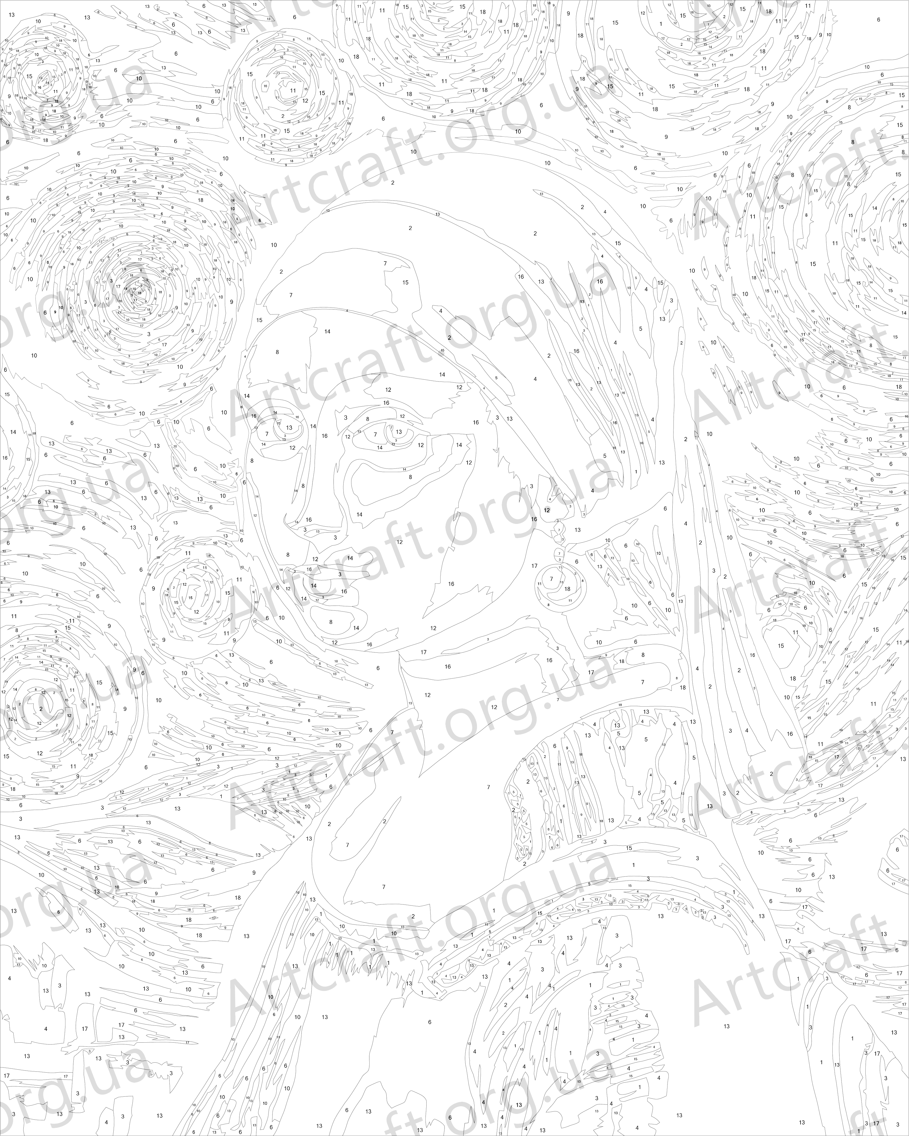 Зроблене з натуральних волокон прогрунтоване полотно з нанесеними контурами та цифрами розміру 40х50 см, щільно натягнуте на деревʼяний підрамник для більшої зручності.