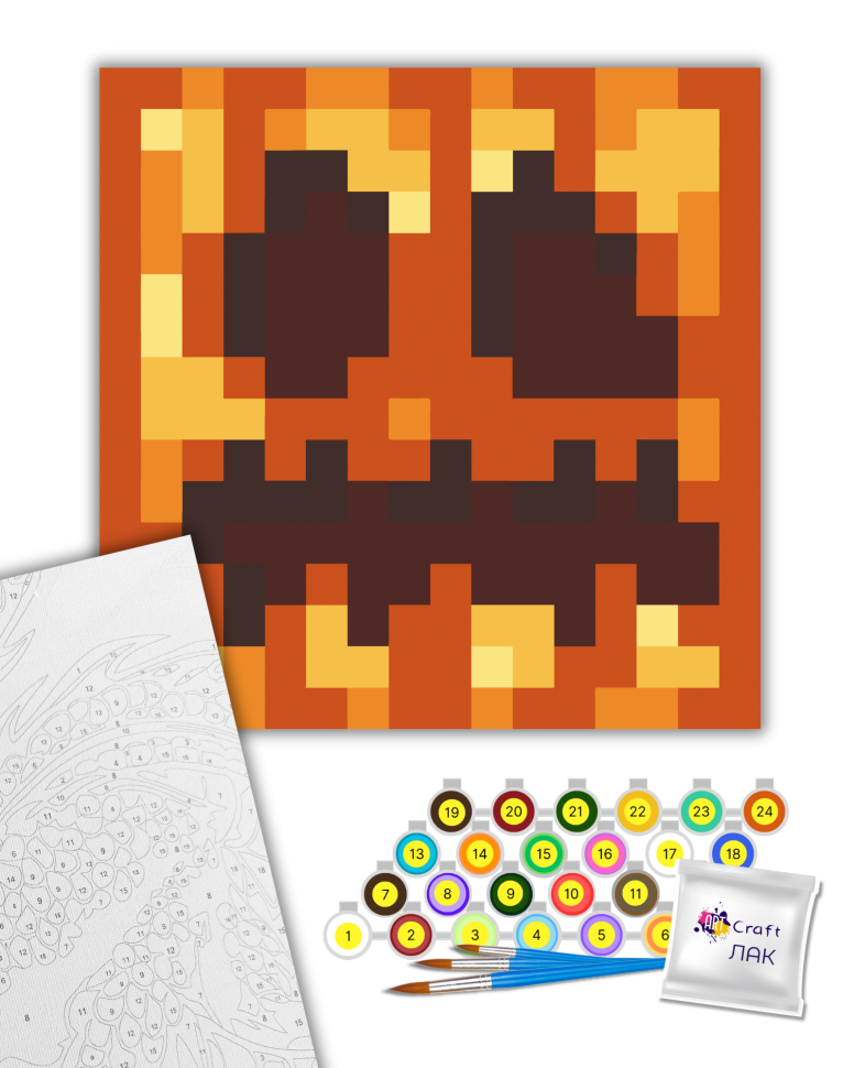 1. Полотно на дерев'яному підрамнику з нанесеними контурами та цифрами. Поєднання збалансованого складу полотна на бавовняній основі, спеціально розробленого акрилового грунту та механічна натяжна – гарантує пружність полотна та стійкість до провисання.