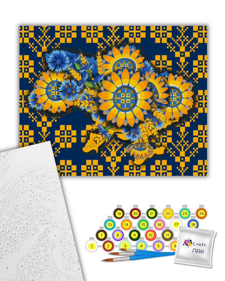 1. Полотно на дерев'яному підрамнику з нанесеними контурами та цифрами. Поєднання збалансованого складу полотна на бавовняній основі, спеціально розробленого акрилового грунту та механічна натяжна – гарантує пружність полотна та стійкість до провисання.