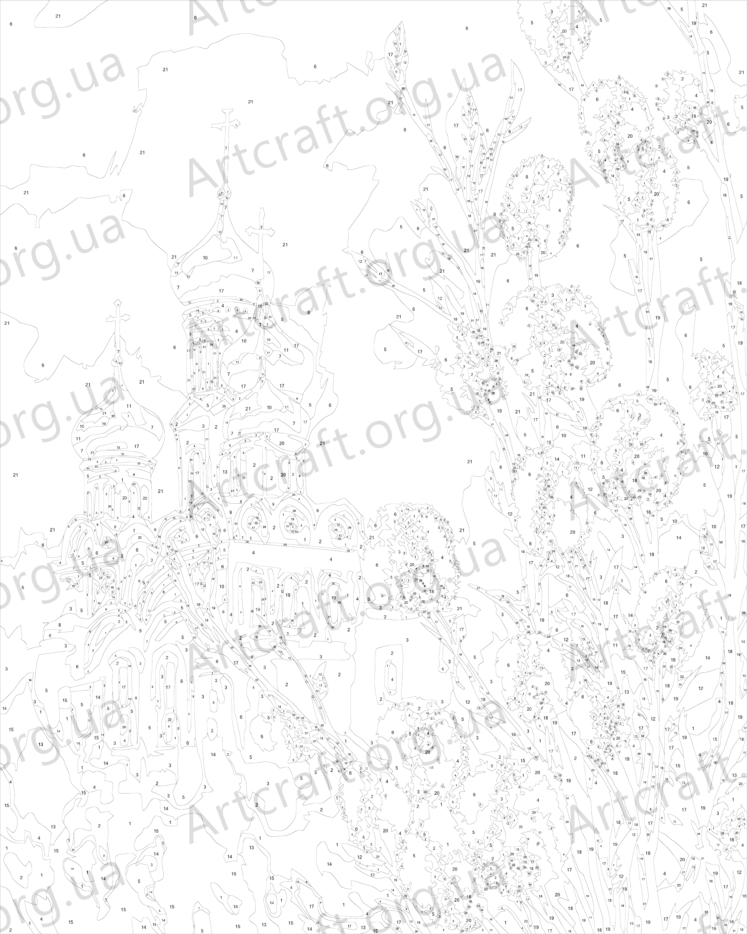 1. Полотно на дерев'яному підрамнику з нанесеними контурами та цифрами. Поєднання збалансованого складу полотна на бавовняній основі, спеціально розробленого акрилового грунту та механічна натяжна – гарантує пружність полотна та стійкість до провисання.